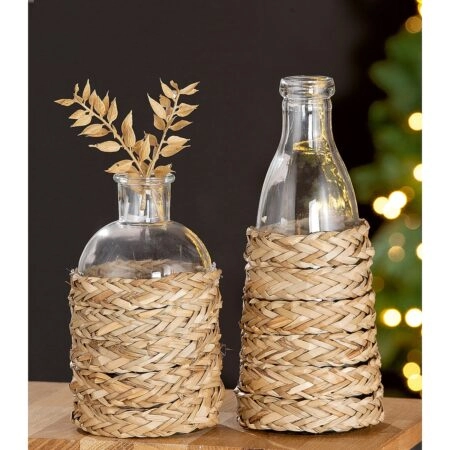 Βάζο Μπουκάλι Διάφανο/Φυσικό Γυαλί/Ψάθα 19.5cm