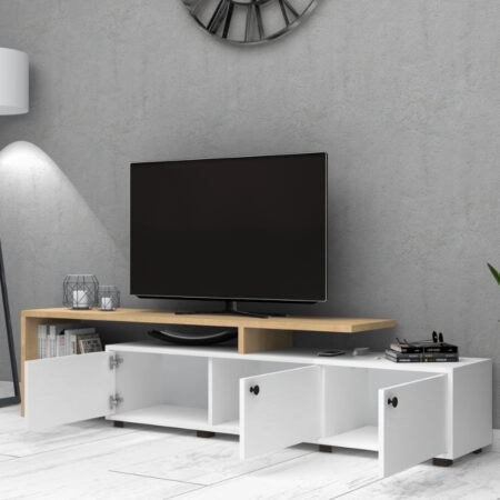 Έπιπλο τηλεόρασης Amadeo Megapap χρώμα λευκό – φυσικό οξιάς 197,5x35x46cm.