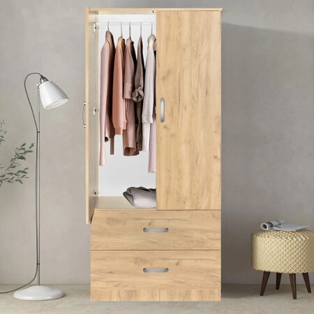 Ντουλάπα ρούχων δίφυλλη Zelia με 2 συρτάρια χρώμα φυσικό 79x42x180εκ