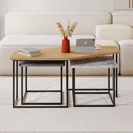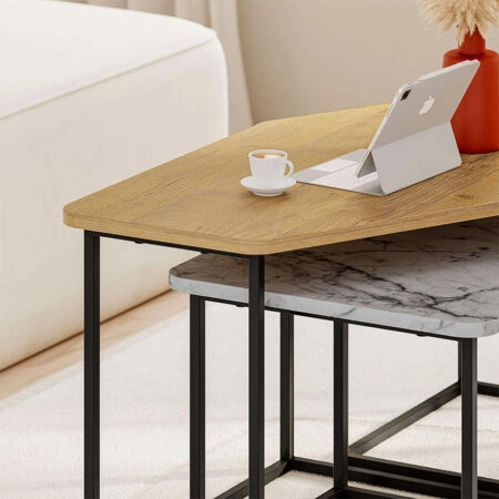 Τραπεζάκι σαλονιού σετ 3 τμχ. Nesty από μελαμίνη χρώμα saphhire oak – γκρι ρετρό – λευκό εφέ μαρμάρου 110x60x48εκ.